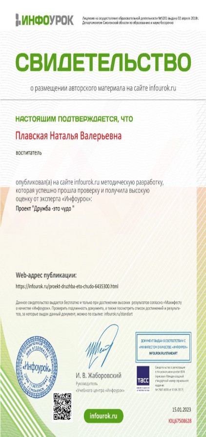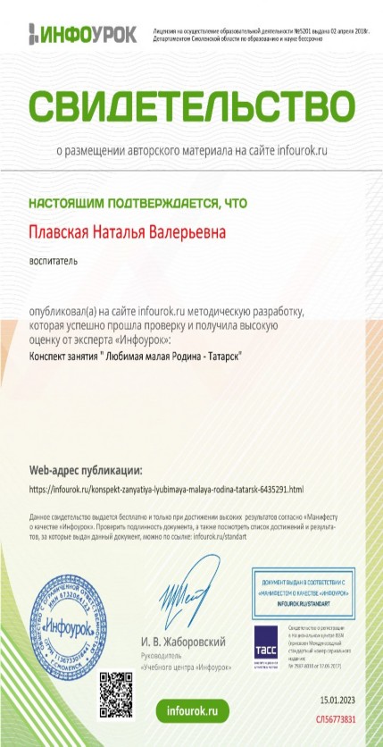 Свидетельство о публикации методической разработки на сайте infourok.ru, 2023 год