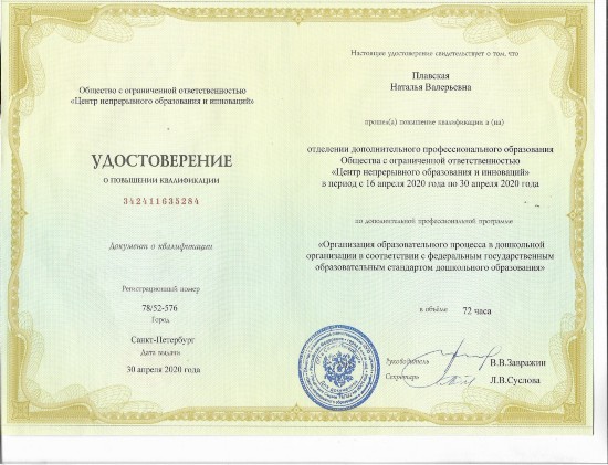 Общество с ограниченной ответственностью "Центр непрерывного образования и инноваций", город Санкт-Петербург "Организация образовательного процесса в дошкольной организации в соответствии с федеральным государственным образовательным стандартом дошкольного образования", в объёме 72 часа, 2020 год.