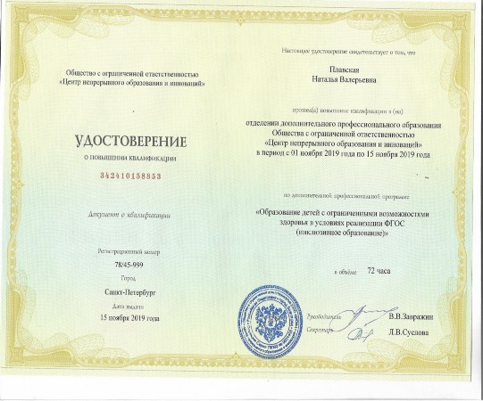 Общество с ограниченной ответственностью "Центр непрерывного образования и инноваций", город Санкт-Петербург "Образование детей с ограниченными возможностями здоровья в условиях реализации ФГОС (инклюзивное образование)", в объёме 72 час, 2019 год.