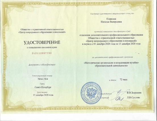 Общество с ограниченной ответственностью "Центр непрерывного образования и инноваций", город Санкт-Петербург "Методическая организация и координация музейно-образовательной деятельности", в объёме 72 час.