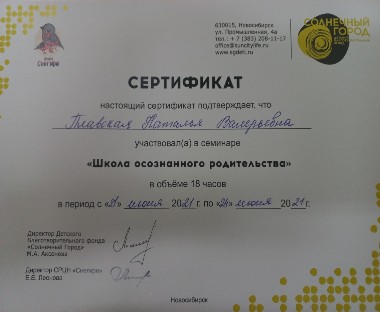 Благотворительный фонд "Солнечный город", город Новосибирск "Школа осознанного родителства", в объёме 18 часов, 2021 год.