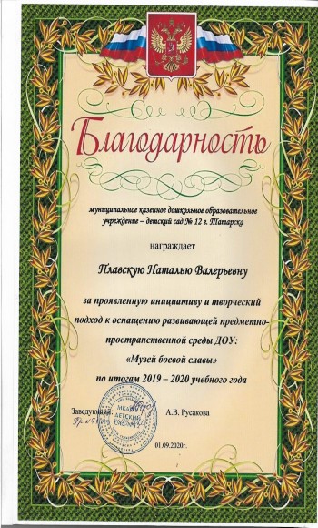 Дошкольный возраст-это благоприятный период воспитания: патриотизма, любви к малой Родине, воспитания таких нравственных качеств, которые позволяют вырасти дошкольнику человеком, гражданином своей страны, патриотом, умеющим ценить историческое наследие русского народа. В МКДОУ-детском саду № 12 города Татарска функционирует музей боевой славы. Являюсь руководителем музея боевой славы и реализую проект по патриотическому воспитанию детей дошкольного возрата. Знакомлю дошкольников с историческим, культурным своеобразием родного города Татарска, Татарского района, Новосибирской области. Организую тематичекие экскурсии для родителй (законных представителей) и воспитанников детского сада.
