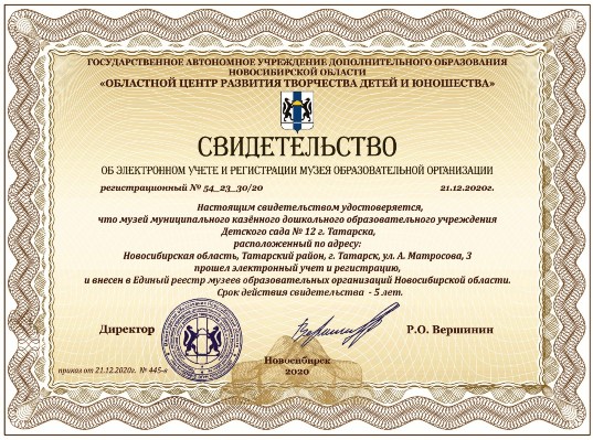 Свидетельство об электронном учёте и регистрации музея образовательной организации, 2020 год