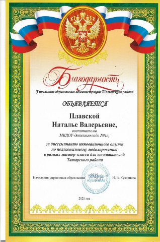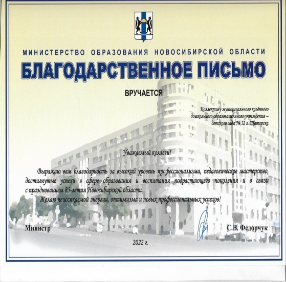 Благодарственное письмо министерства образования Новосибирской области, 2022 год